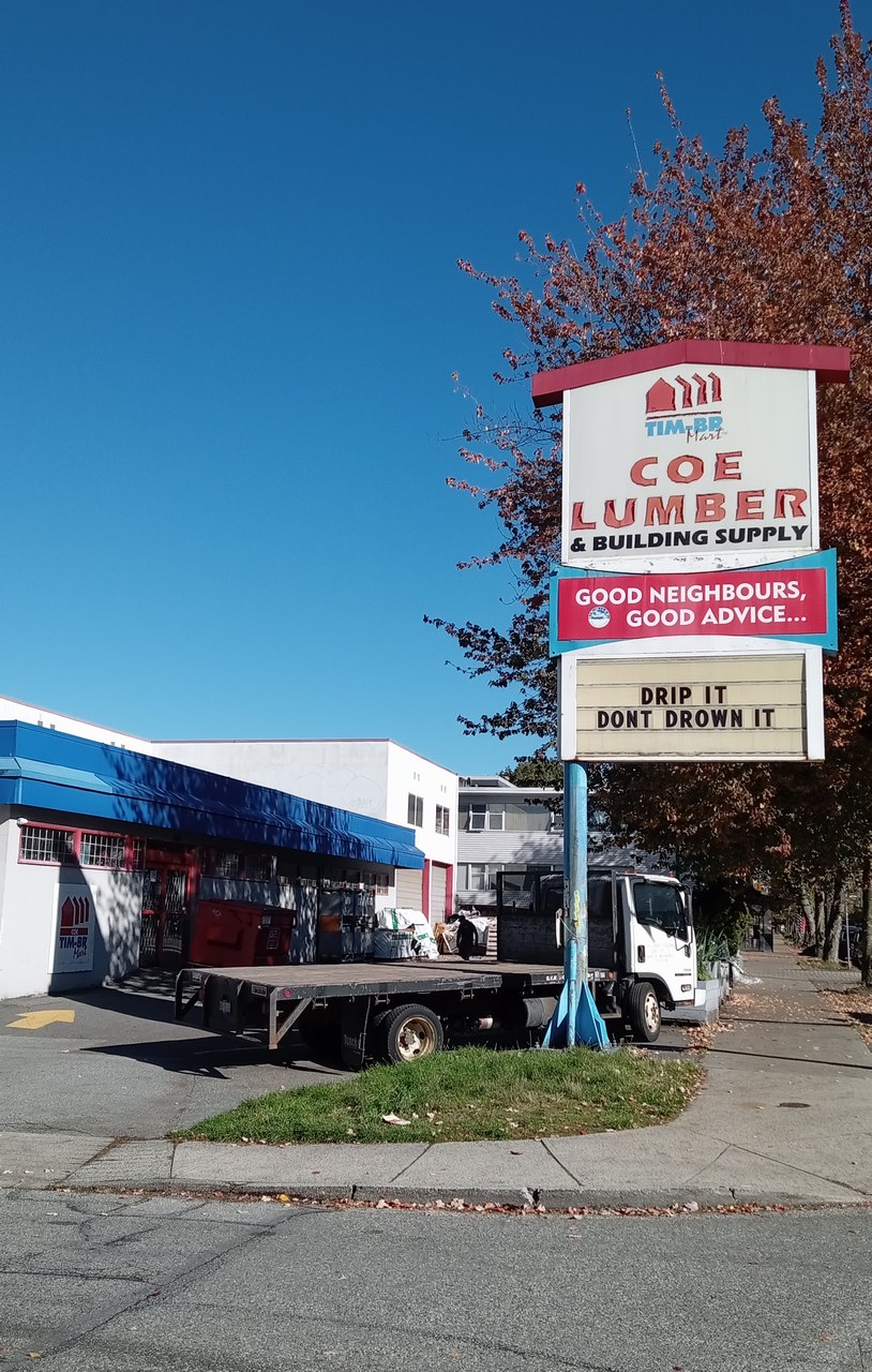 West BroadwayのCOE Lumberは,街の材木屋だよ。ピックアップトラックで乗り付けて,DIYを楽しむ,みたいな感じの店だね。