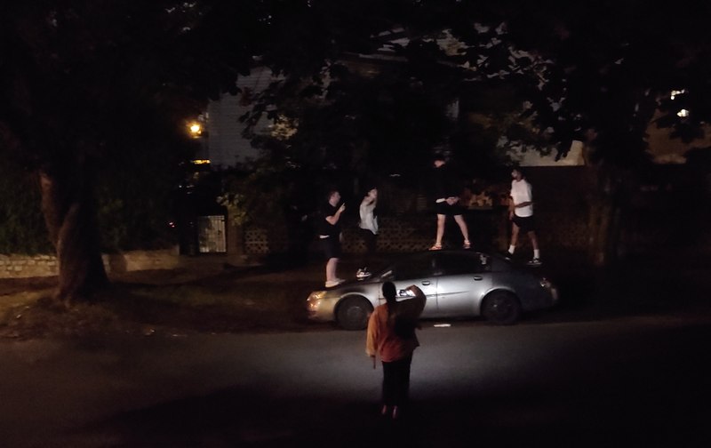 こちらの写真は,週末の夜中に(たぶん大麻とかやって)「ヒャッホー!」と自分の車の上に乗ったりパンツを下ろしたりしてして大騒ぎしてたら,オカンが出てきて「ちょっとアンタたち,何やってんのよ!」と叱られて凍るようにシュンとしている学生らの画像。