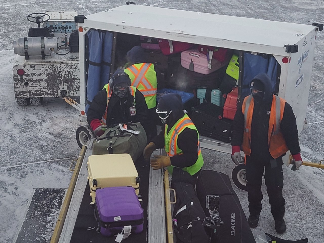 マイナス40度以下での屋外業務は過酷。ベルトローダーが凍って張り付いてしまうので,バッチンバッチン手ではがし続けないといけない。ナイロンや布のカバンはパリンパリンのシャカンシャカンに凍ってるよ。
