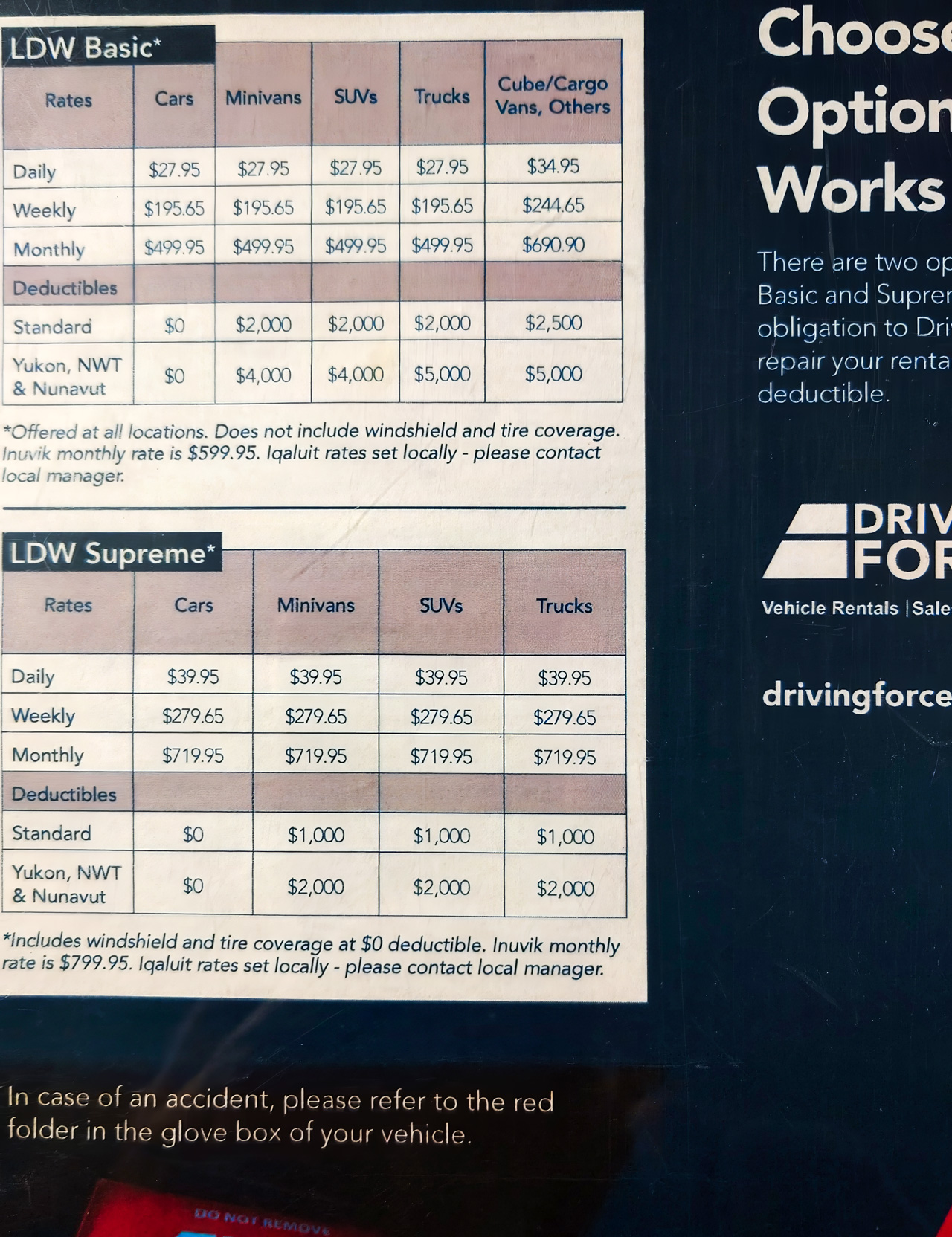 空港のDRIVING FORCEでMiddle size SUV(RAV 4だった)を借りたよ。飛び石でフロントウィンドウの下のほうにヒビがビシッと横一線で入ってたけど,ここも「大丈夫」の一言だった。エアバッグの警告灯がつきっぱなしだった。保険(免責保障:LDW)が2種類で,高いほうは窓割れとタイヤパンクに対応するだけの違いだった(ので安いほうにした)。
