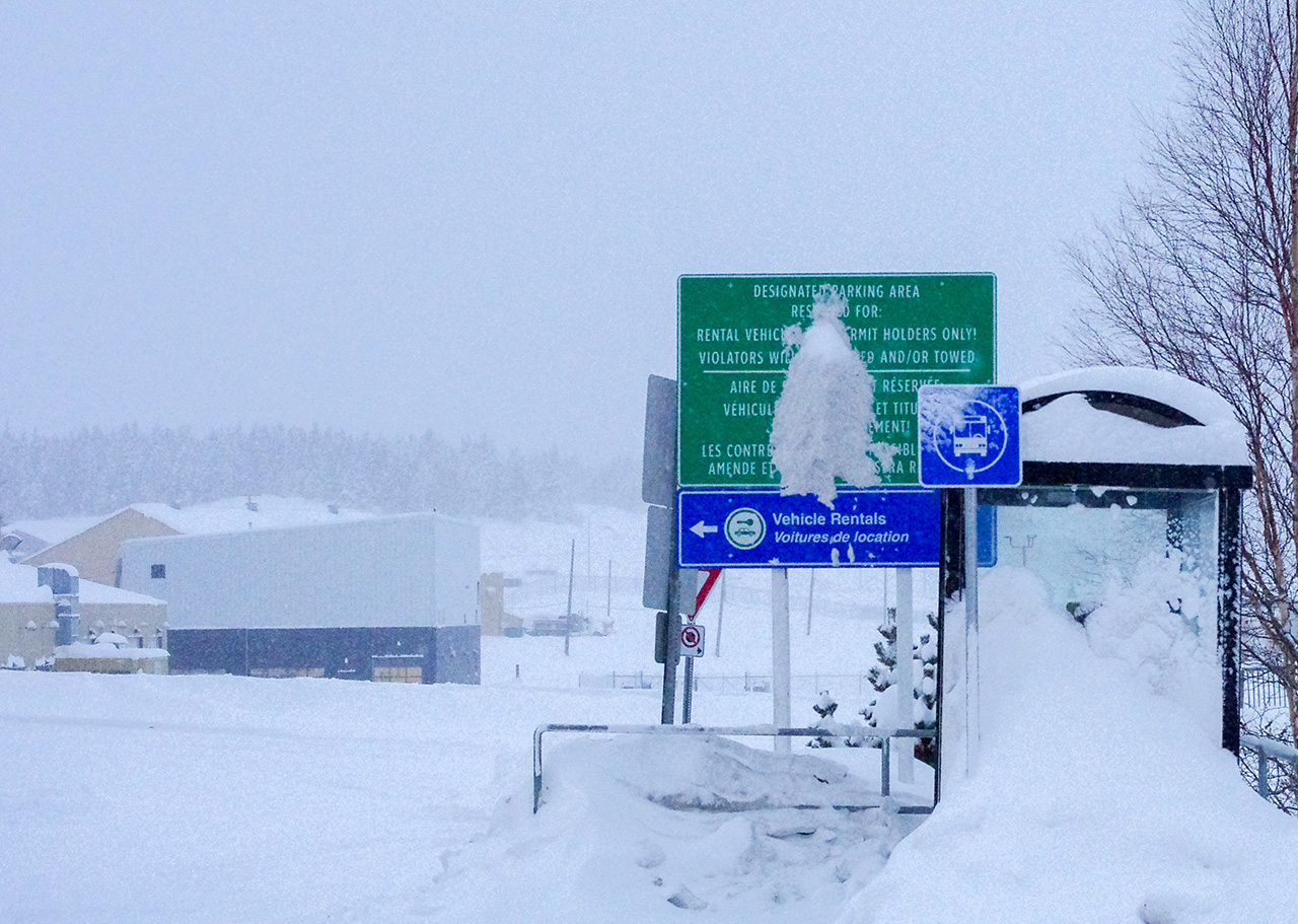 帰りの空港のレンタカー置き場に迷いそうになったよ。道路から壁からどこも真っ白でどこに入口があるかわからないよ。雪でよく見えなくなっている「レンタカーはこちら」標識を探しだして,その横の「多分ここが道」と思ったところを走ると入れたよ。
