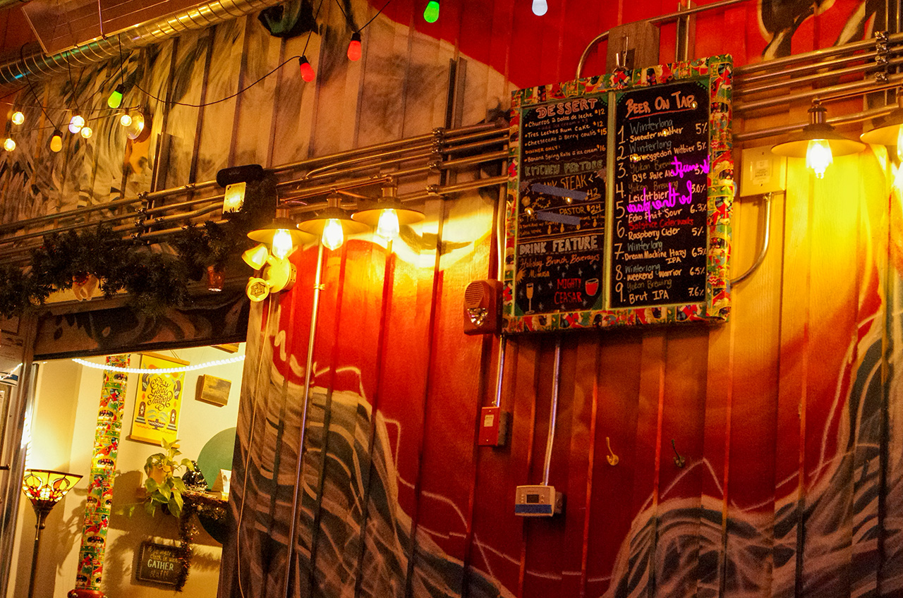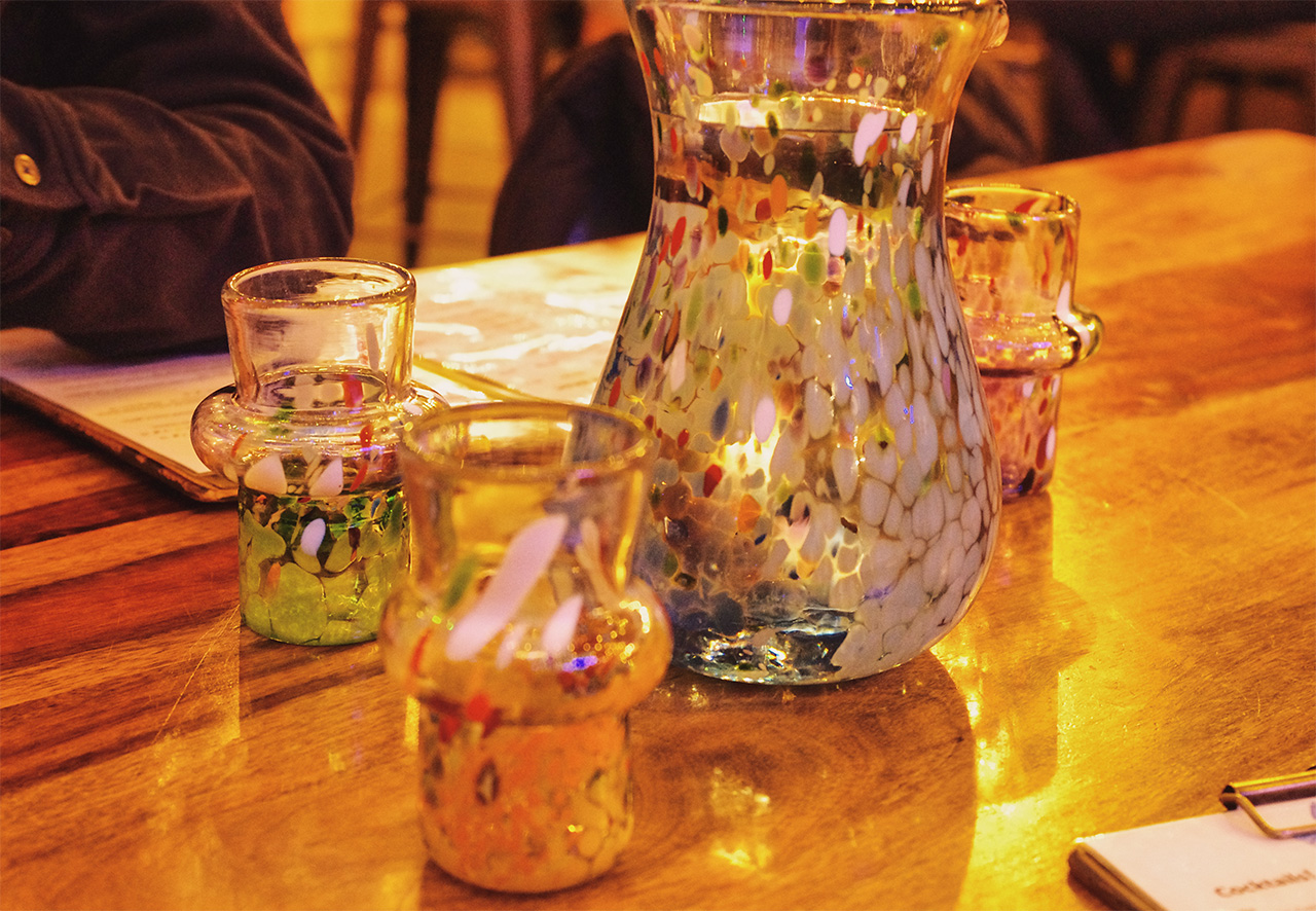 ホテル「Raven Inn」の斜向かいのGather Cafe & Taphouseはタコス・レストランだよ。同じ建物のLumel Studiosっていうガラス工房が本業らしく,このレストランでも食器として工房のかわいい作品が使われているよ。