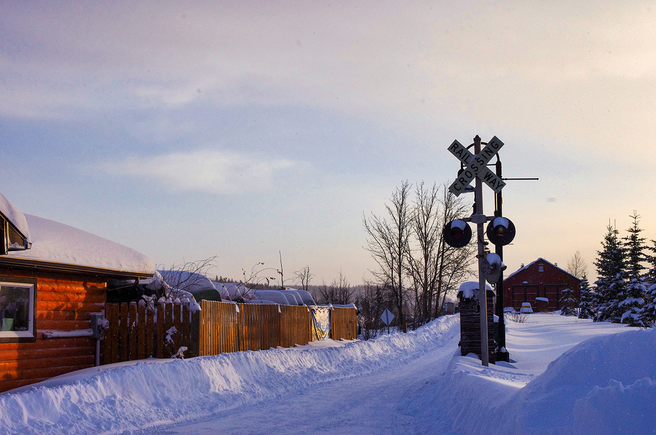 雪がなくなると「White Pass & Yukon Route」という観光列車が走るよ。冬だったので,雪にうもれていたよ。
