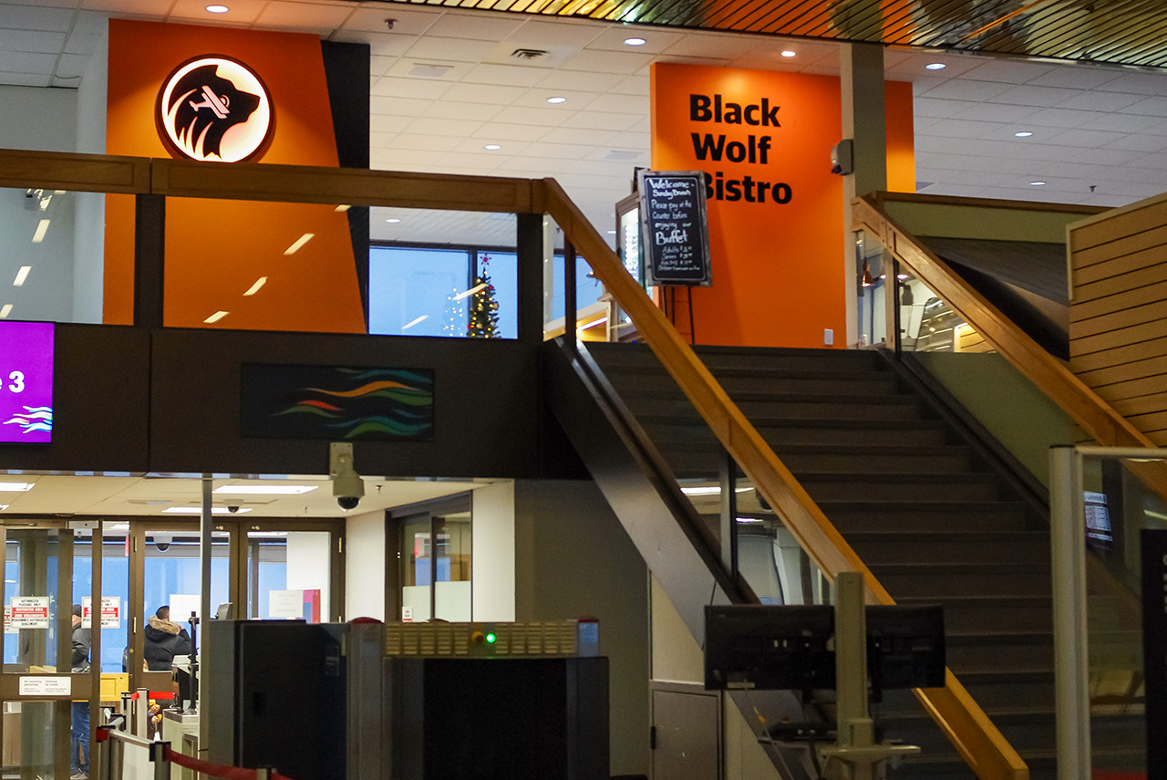 Black Wolf Bistroは,空港の2階(制限区域外)にある軽食屋だよ。エアノースの機内食を担当するチームによる地元運営のお店だよ。ここでは食べてないから知らないけれど,機内食の味からするときっとおいしいはずだよ。4時とか5時とかに閉まっちゃうけど。