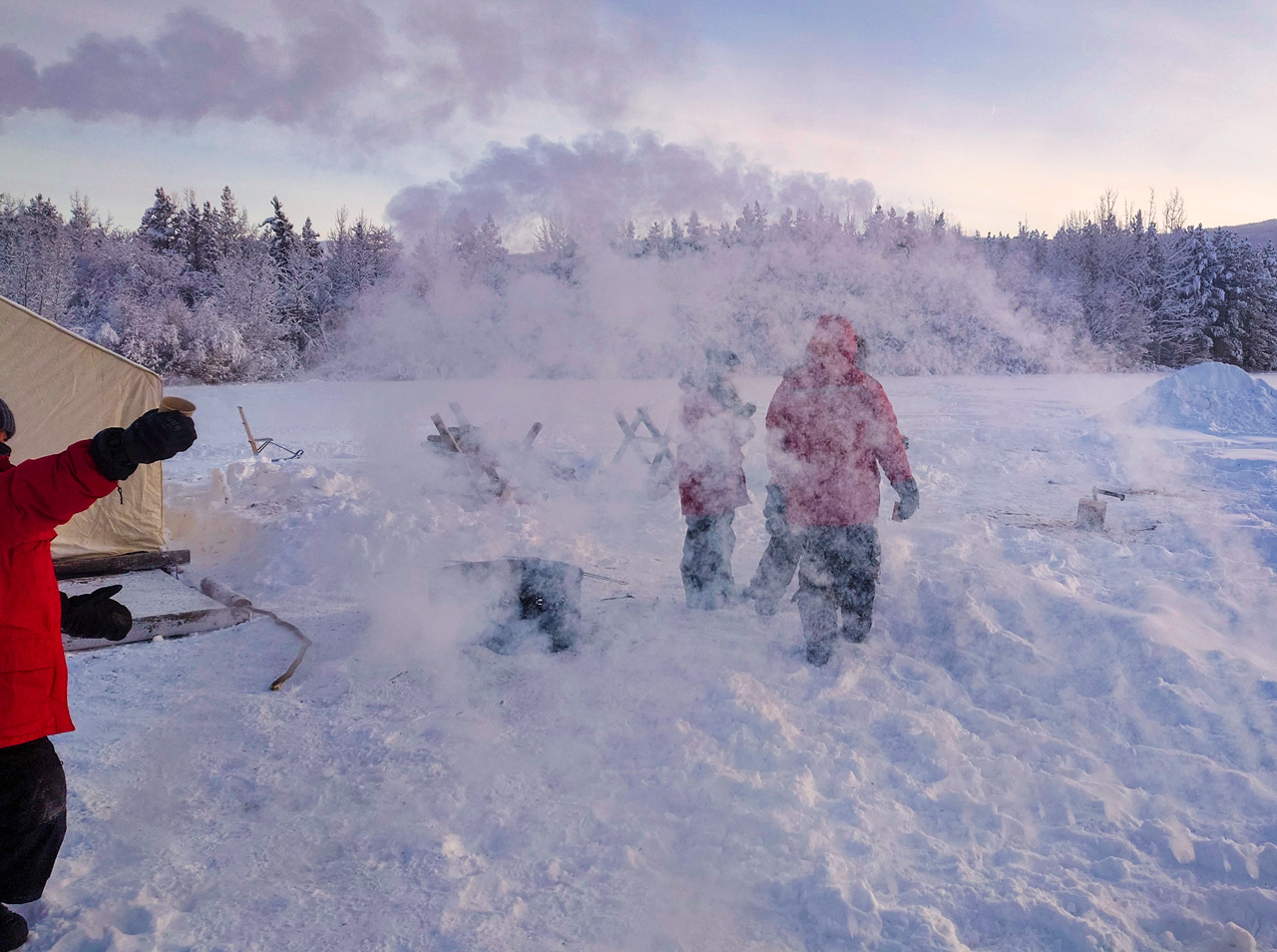 とはいえ,いくら重装備を借りたからと言っても,さすがに素人がマイナス40度以下の山を歩き回るとガチで死んでしまうので,手押しぞりとか,火起こしとか,森の散策とか,カチコチ洗濯物とか,短いメニューを組み合わせたツアーに変更されたけど(とにかく長時間外に出てはイケナイことを徹底していた),ガイドもイケてて,急遽建てられたあったまるための小屋の中でのスプルースのお茶やバイソン肉のホットドッグとかもあって,楽しかったよ。お湯をまき散らすと空中で一瞬で氷になる,ってのも教えてくれたよ。宿で自分でやってみたときに凍らなかったのは,お湯じゃないとダメなんだね。