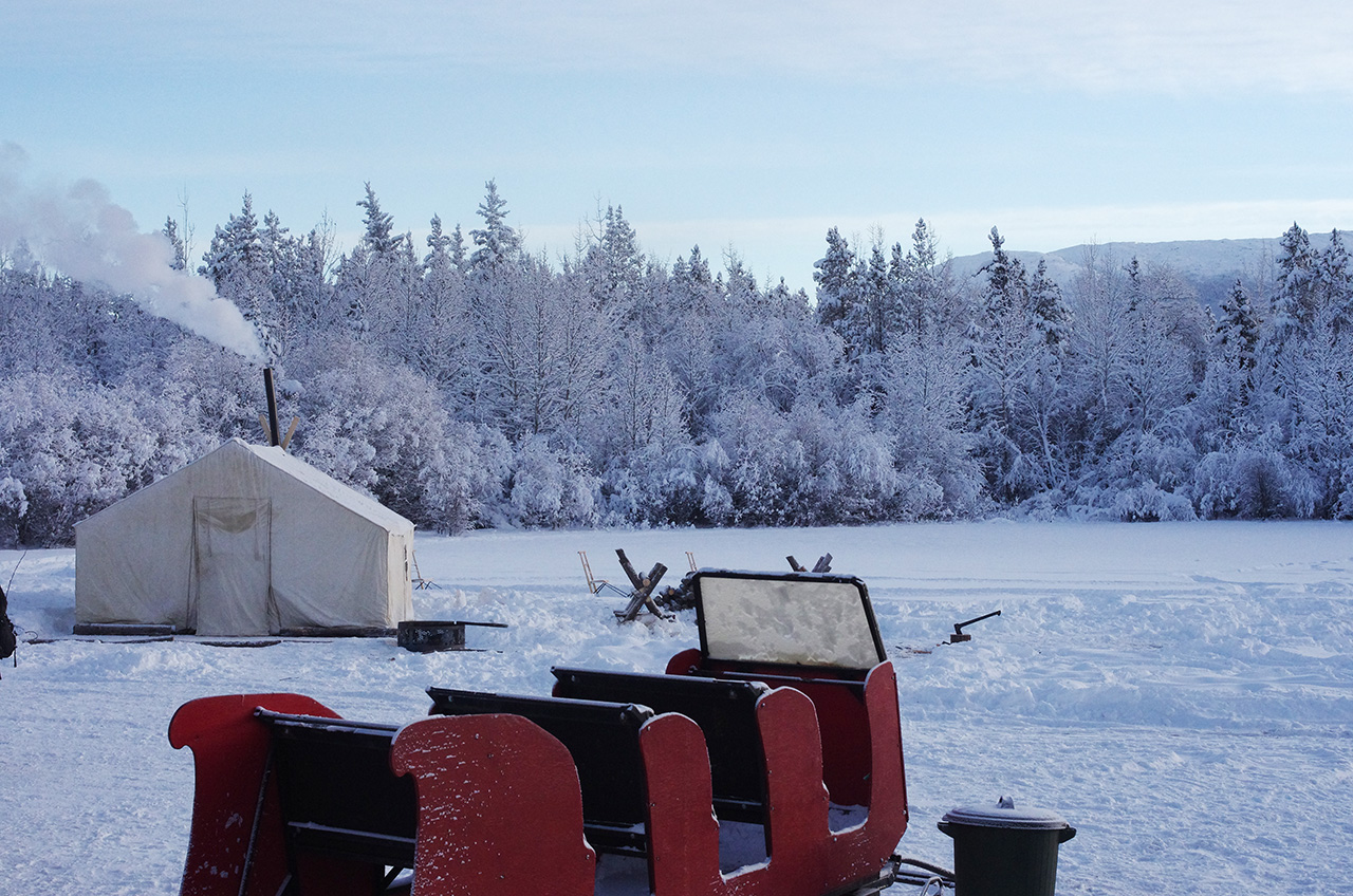 ダウンタウンまでバンで迎えに来てくれて,Ibex Valleyのほうまで連れて行ってくれたよ。着いたら小屋があって基本装備を貸してくれるよ。この装備を置いてある小屋が薪ストーブがついているのにマイナス30度くらいの激寒で眼鏡が凍るから何をしてるのかわからずタイヘンだったよ(写真のテントは,寒さに備えて急遽建てられた待避所で,こっちはポカポカ暖かい)。