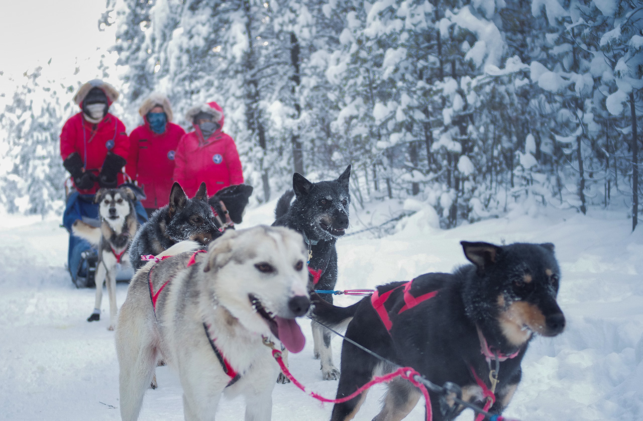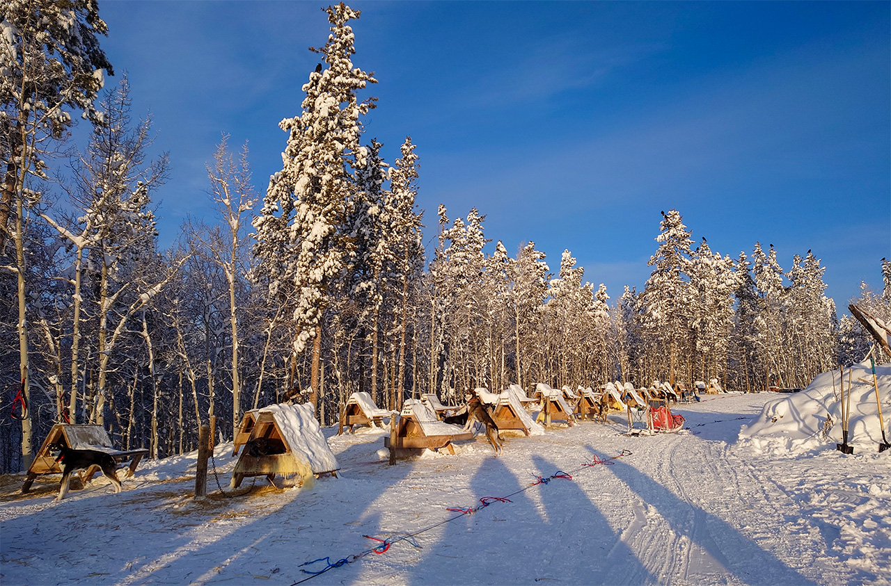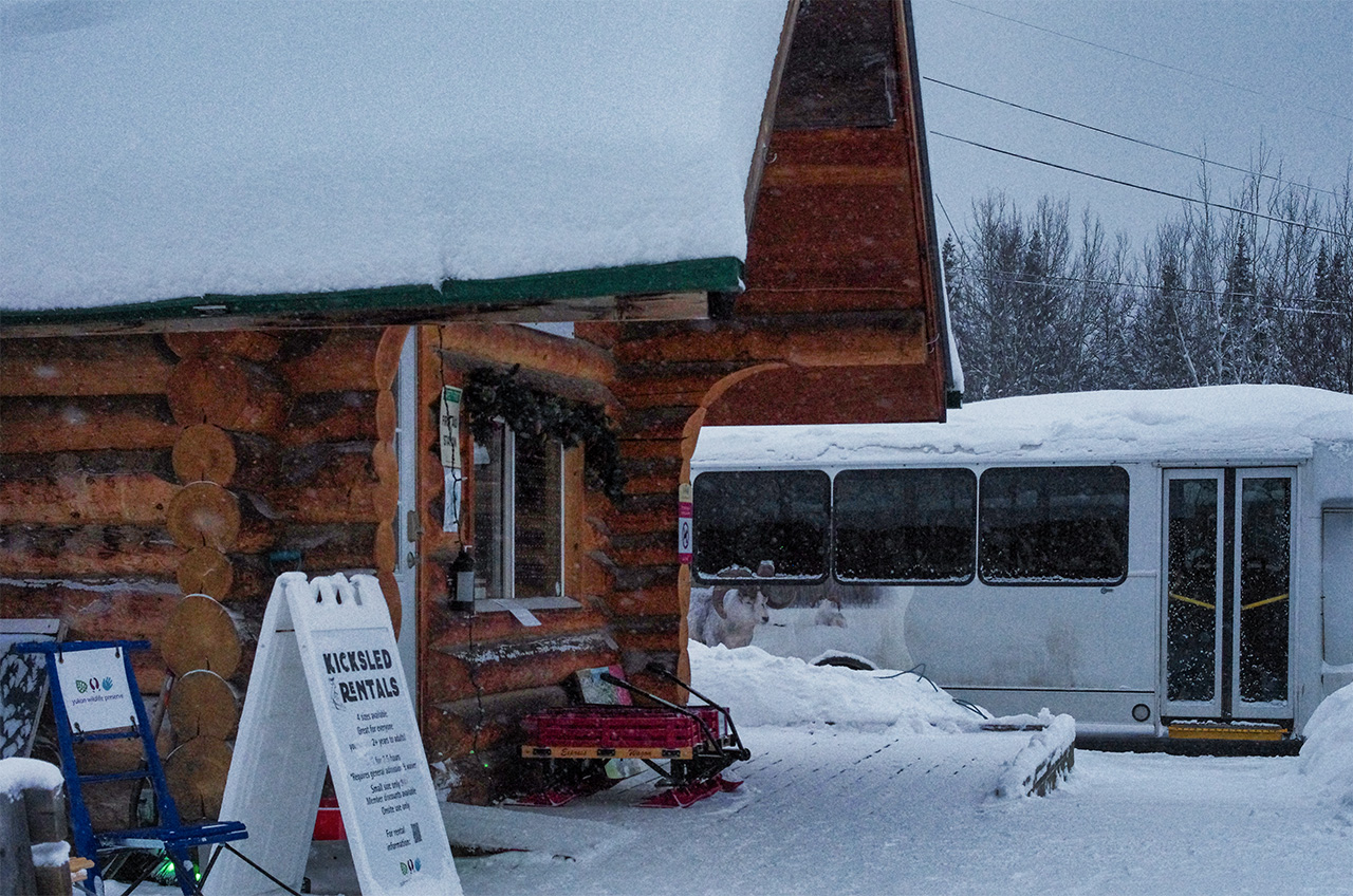 Elevation Sled Dogsの犬ぞり体験ツアーに参加したよ。こちらは車で現地まで行けるよ。ここも基本装備を貸してくれるよ。これら本格装備は写真のとおり普通のとは全然違う。ここのウェルカム棟は暖かい。というか気温がマイナス23度あったので,そこまで寒くなかったよ(一度マイナス40度台を体験すると,感覚がおかしくなる)。